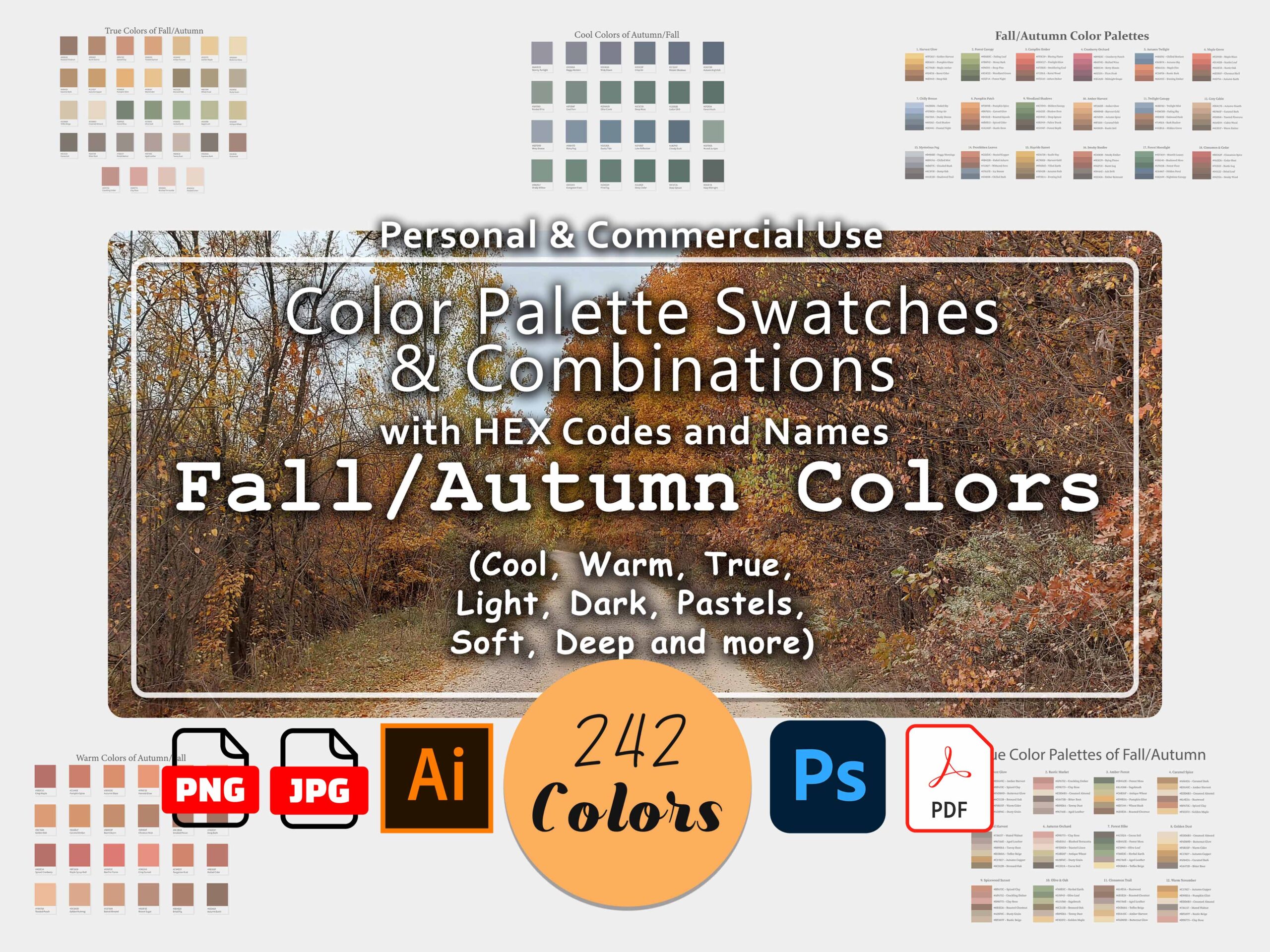 Discover 242 curated Fall/Autumn color swatches featuring Warm, Cool, and True tones—ideal for design, branding, and illustration.