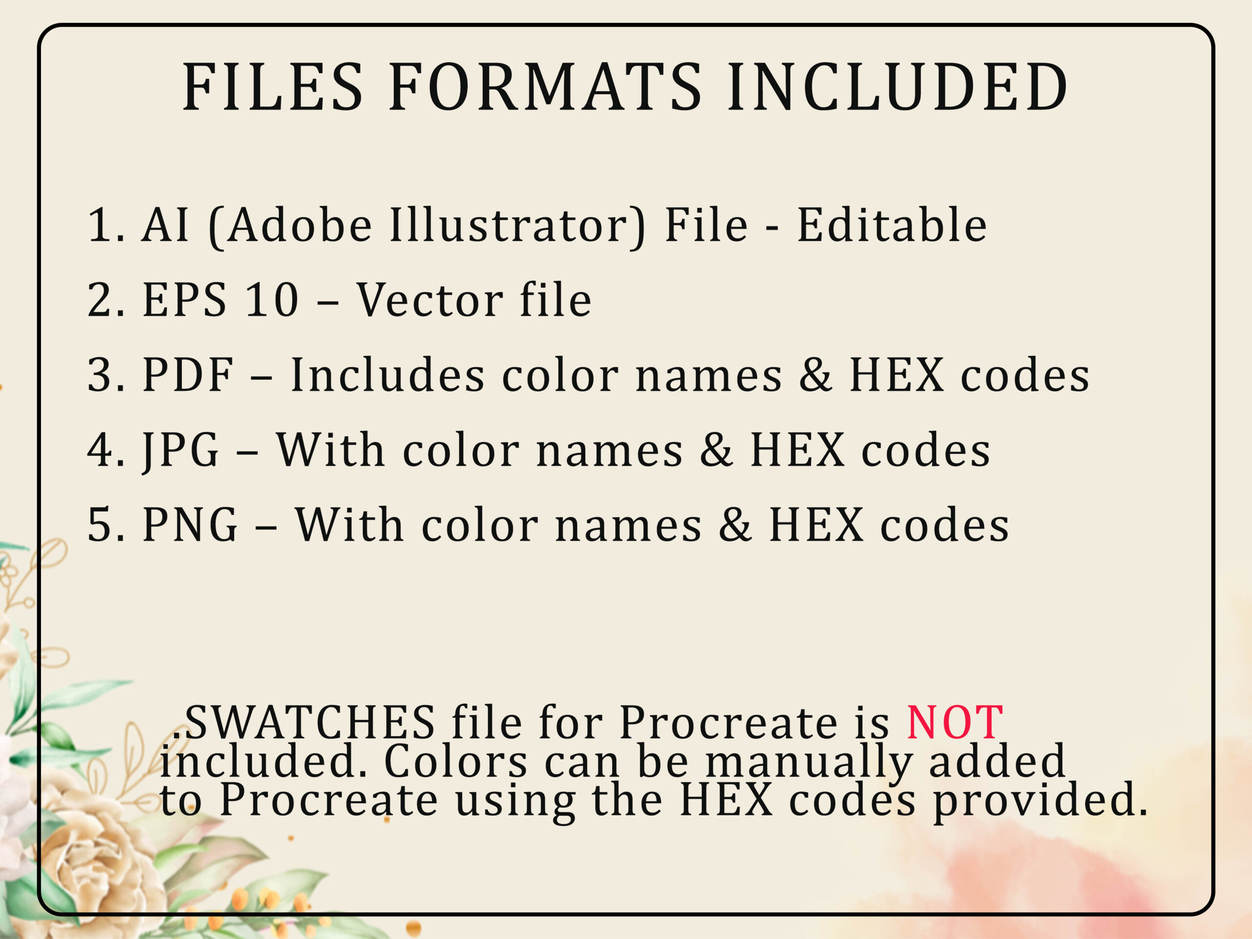 1- .SWATCHES file for Procreate is NOT included. You can manually add colors using the provided HEX codes.