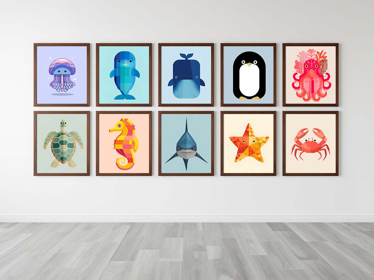 Make a splash in your child’s space with our Sea Animals Nursery Wall Art Prints, a vibrant kids room decor pack featuring geometric ocean illustrations of whale, sea turtle, shark, starfish, seahorse, penguin, crab, dolphin, jellyfish, and octopus. Perfect as printable nursery wall art, this collection brings a calm coastal vibe to any nursery or playroom. Each piece is a digital download wall art designed for easy printing and timeless ocean-inspired charm — ideal for nursery prints for boys and girls who love the sea.