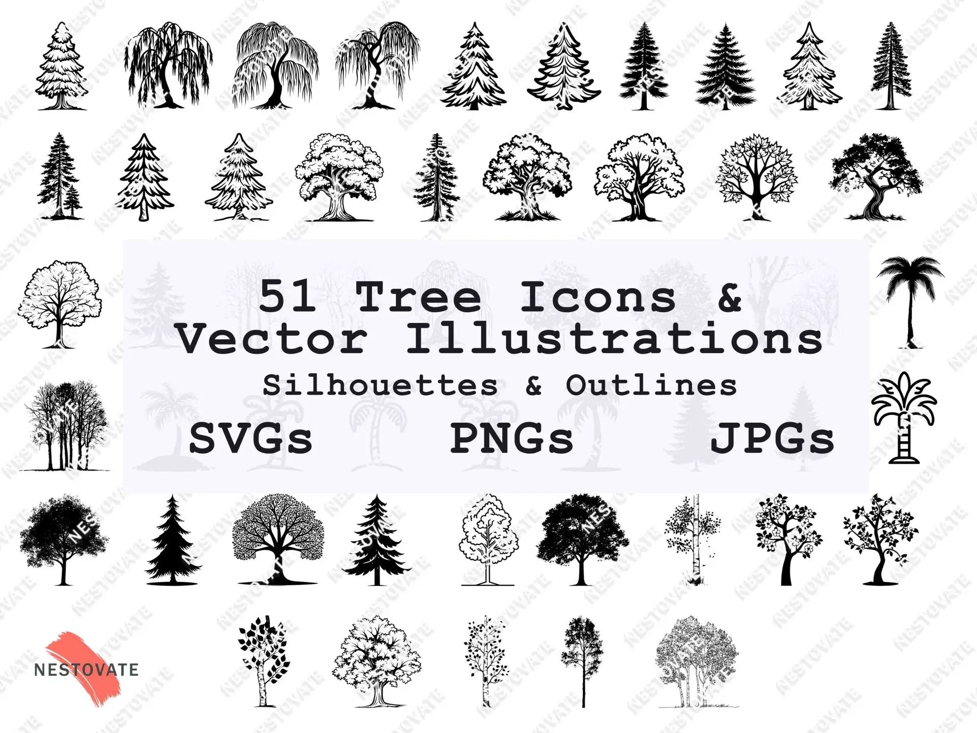 A beautiful set of 51 different tree icons in 3 unique styles – black silhouette, outline, and linocut – perfect for digital designs, nature projects, prints, branding, and more. These tree illustrations include a wide variety from leafy to evergreen species.