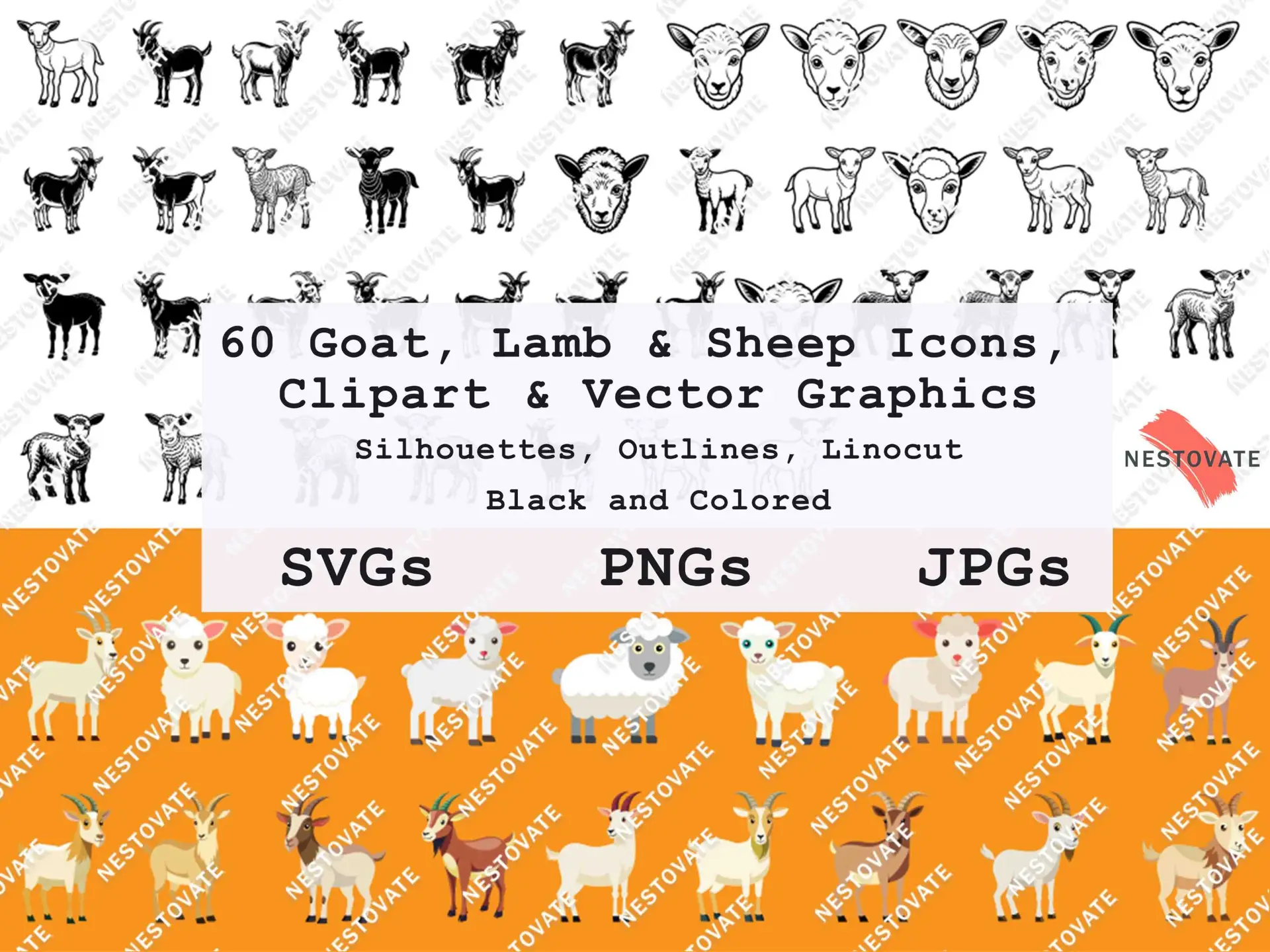 60 goat, sheep, and lamb vector icons – includes SVG, PNG, and clipart in silhouette, outline, and linocut styles. Perfect for farm projects, Cricut crafts, and digital design for Personal and Commercial Licenses. Use code "6F9B05L" at checkout to get an extra 20% off!