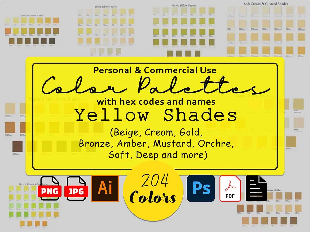 Explore the ultimate Yellow Tones, featuring 204 beautiful hues, tones, and color combinations! This collection is perfect for graphic designers, branding, digital projects, and creative design work, ensuring you have the ideal yellow color scheme for any project.